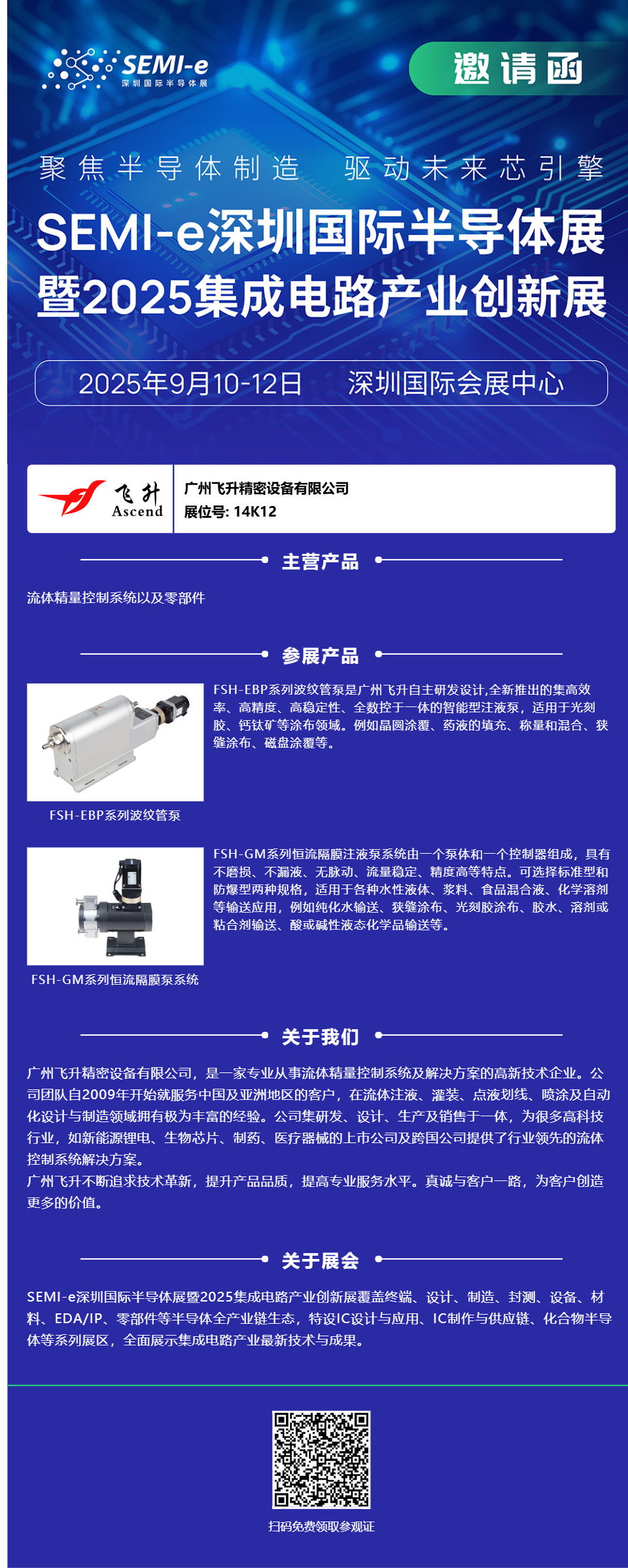 本(běn)周,廣州飛升精密設備有限公司將攜(xié)專業實力亮相深圳 SEMI-E 半導體展會——即 "SEMI-e深(shēn)圳國際半導體展暨2025集成電路(lù)產業創新展"。作為中(zhōng)國集成電路產業全鏈條技術展示與交流的(de)核(hé)心平台,本屆展會將於9月10-12日在深圳國際會(huì)展中心(寶安新(xīn)館(guǎn))舉辦,由中國(guó)國際光電博覽會與集成(chéng)電路創(chuàng)新(xīn)聯(lián)盟聯合主辦,與第26屆中國國際光電博覽會同期同地(dì)呈現,形成 "光電 + 半導體" 的產業協(xié)同效應,雙展聯動打造總麵積達 32 萬平方米的技術盛宴。