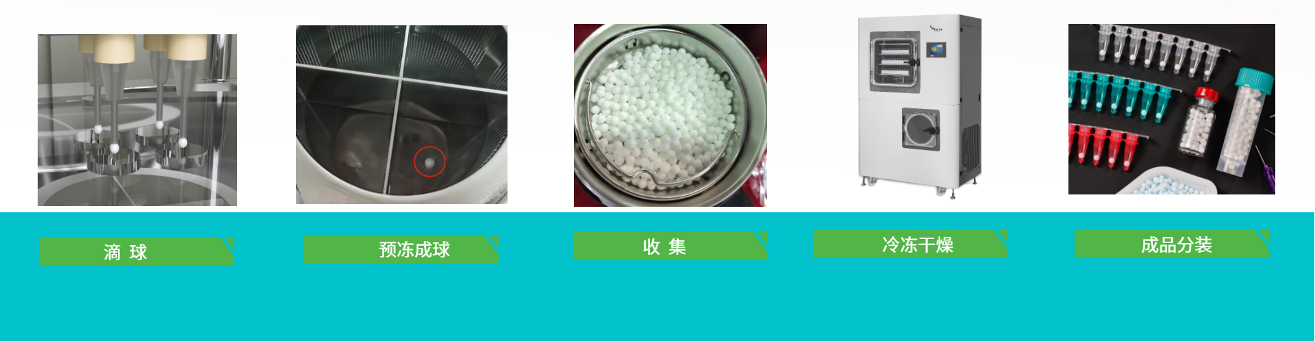 凍幹珠是(shì)一種利(lì)用液氮的低溫特(tè)性和冷凍(dòng)幹燥技術相結合形成的產品。其原理是將定量的試劑(jì)滴到液氮內部,通過液氮的低溫使樣品迅速冷凍,預凍成球狀。然後通過真空環境下凍幹機的幹燥過程,將樣品中(zhōng)的水分轉化為冰(bīng)晶,最終將冰晶通過升華的方式去除,從(cóng)而實現樣品的冷凍幹燥,形成凍幹珠。最後通過特定的分裝設備(bèi),將凍幹珠(zhū)分裝到8連管,96孔板,EP管等多種載具內。