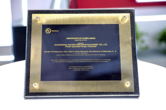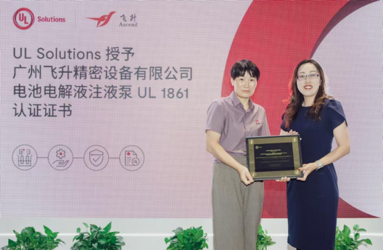 廣州飛升精密設備有限公司創新的電池電解液注液泵獲得基於UL 1861的認證證書。