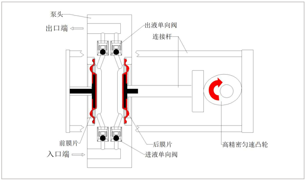 電機帶動凸輪轉動並通過連接杆驅動前膜片(piàn)及後膜(mó)片做往複運動(dòng),由單向閥輪流進行吸液及排液,通過兩個泵室的相對獨立機構,前後(hòu)泵頭反複交替吐出,使流量保持恒定,實現恒流無脈動出液。