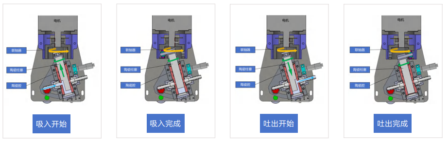 當泵工作時,由主電機帶動柱塞泵進行旋轉往複運動,旋轉運動改變(biàn)閥向,往複運動切換進出液。