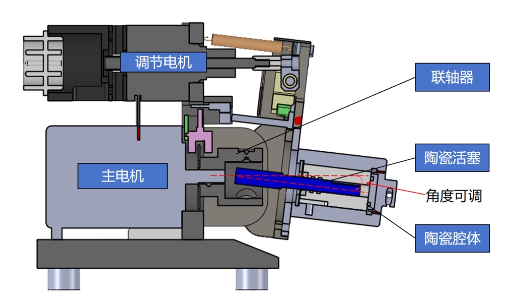 當注液(yè)泵工作時(shí),由(yóu)調節電機調節(jiē)泵頭旋轉角度改(gǎi)變陶瓷柱塞(sāi)泵的行程。主電機帶動陶瓷柱塞泵進行旋轉往複運動,旋轉運動(dòng)改變閥向,往(wǎng)複運動切換進(jìn)出液。液體(tǐ)通過進液管(guǎn)及(jí)出液管吸進與排出。
